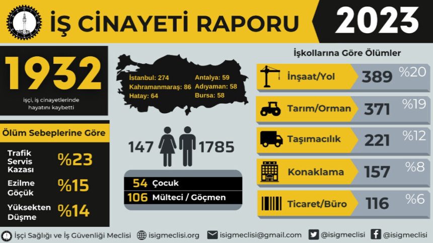 Meclîsa Tenduristiya Karkeran û Ewlehiya Kar (ÎSÎG) Rapora Cînayetên Kar a Sala 2023’yan parve kir. Li gorî raporê; di salekê de hezar û 932 karkeran di encama cînayetên kar de jiyana xwe ji dest dan. Cihê herî zêde karkeran jiyana xwe lê ji dest dane jî Stenbol e. Li gorî vê yek; li Stenbolê 274 karkeran, li Mereşê 86 karkeran, li Hatayê 64 karkeran, li Antalyayê 59 û li Semsûr û Bursayê jî 58 karkeran di encama cînayetên kar de jiyana xwe ji dest dan.