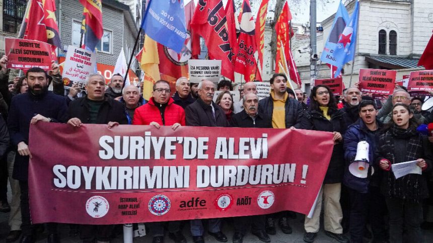 Saziyên Elewiyan yên ku li Stenbolê li hev civiyan, êrîşên qirkirinê yên çeteyên cîhadîst ên girêdayî hikûmeta demkî ya Sûriyeyê li ser gelê Elewî tê meşandin protesto kirin. Gelek partiyên sosyalîst ên mîna ESP, Kaldiraç, Partîzan, SEP, TÎP û Yeşil Sol piştgirî dan çalakiya ku li Qada Khalkedon a Kadikoyê hat lidarxistin. Di çalakiyê de pankarta “Qirkirina Elewiyên li Sûriyeyê rawestînin” hat hilgirtin û dirûşmeyên bi Erebî û Tirkî “Qatil Colanî, hevkar AKP,” û “Qatil Colanî ji Sûriyeyê derkeve” hatin berzkirin. Saziyên Elewiyan diyar kirin ku ew zîhniyeta li pişt êrîşên li ser Elewiyên li Sûriyeyê ji Sêwas, Mereş, Çorûm û Gaziyê nas dikin û gotin, ”Elewî wê çong daneynin! Hûn nikarin bi me çong deynin!”