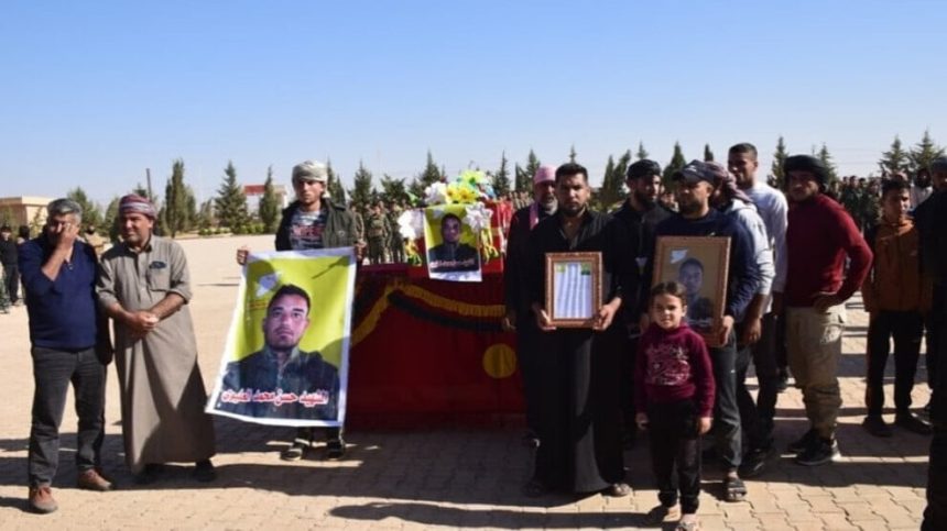Meclisa Malbatên Şehîdan a bajarê Şedadê yê kantona Cizîrê ji bo şervanê QSD’ê Hesen Mihemed El Ilêwî yê ku 20’ê vê Cotmeh (2025) li gundewarê Dêrazorê ji ber teqîna mayînekê şehîd bibû, merasîma cenaze li dar xist.