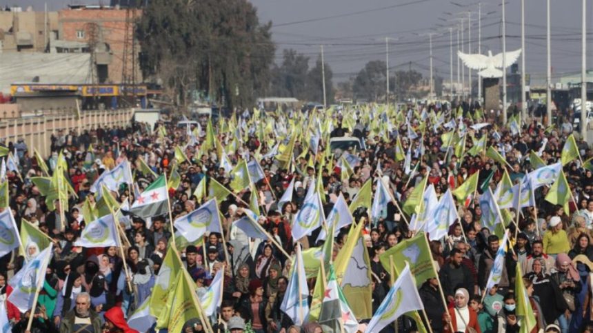 Şêniyan alên QSD`ê, yên Rêveberiya Xweser a Bakur û Rojhilatê Sûriyeyê, ala serxwebûnê ya Sûriyeyê hildan û dirûşmên “Yekitiya pêkhateyan misogeriya aramiyê ye”, “Na ji dagirkeriyê re”, “QSD hêza me ye”, “Bijî biratiya gelan”, “Bijî yekitiya gelê Kurd” û “Bijî berxwedana Rojava” berz kirin.