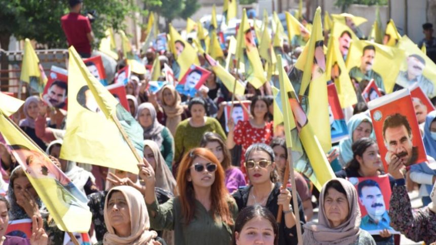Di meşê de wêneyên Rêberê Gelê Kurd Abdullah Ocalan û pankêrtên bi nivîsa; ‘Ji Rêber Apo re Azadî û ji Pirsgirêka Kurd re Çareserî’ hatin hilgirtin.