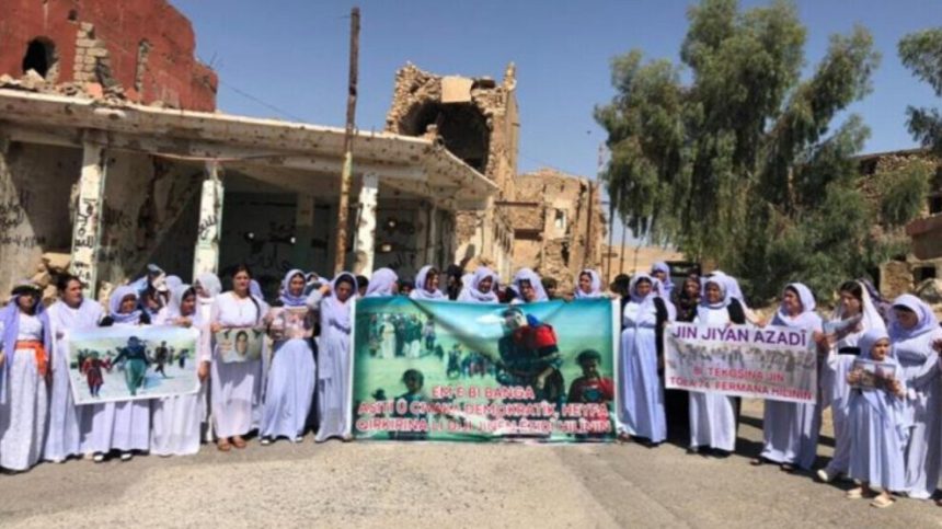 Tevgera Azadiya Jinên Êzidî (TAJÊ), bi wesîleya 11’emîn salvegera Fermana 74’an bi dirûşma ‘Emê Bi Banga Aştî û Civaka Demokratîk Heyfa Qirkirina Li Dijî Jinê Êzidî Hilînin’ li Sûka Kevn a Şengalê daxuyanî da.
