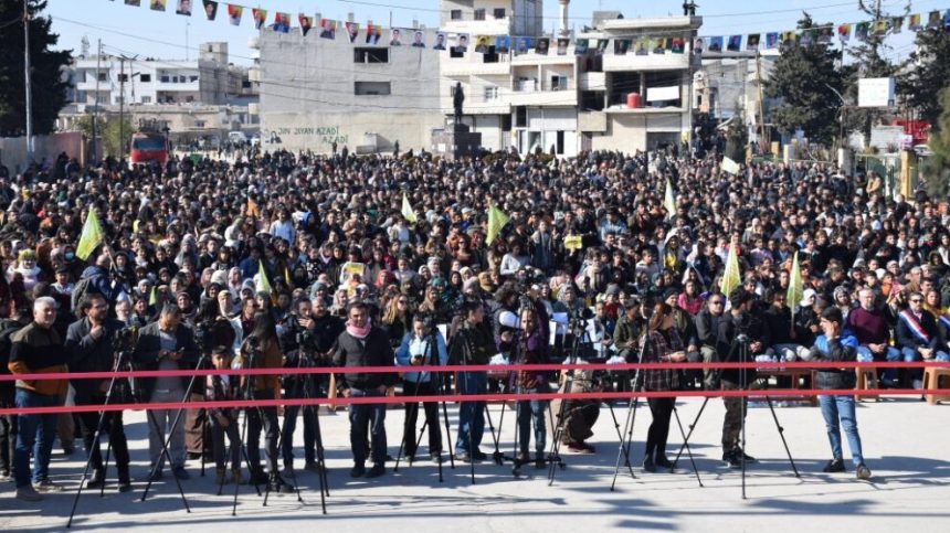 Di şahiyê de aliyê QSD`ê û YPG’ê û YPJ’ê û wêneyên şehîdan hatin hildan û bê navber dirûşmên “ Bêjî berxwedana Kobanê” û “Berxwedan jiyane” û “Bêjî berxwedana QSD`ê” hatin berzkirin.