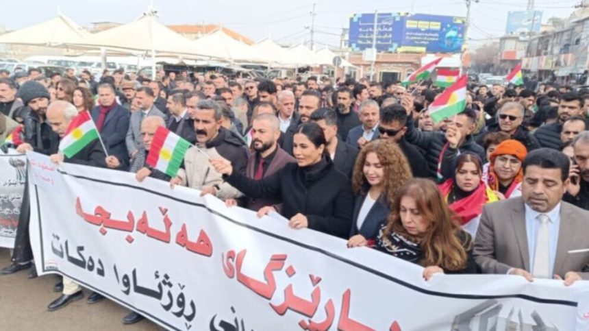 Bi beşdariya rêxistin, partî, berpirs û welatiyan li bajarê Helebceyê ji bo piştevaniya berxwedana taxên Kurdan ên Şêxmeqsûd û Eşrefiyê yên li Helebê û şermezarkirina êrişên çeteyên ser bi hikûmeta demkî ya Şamê û dewleta Tirk ên li ser Kurdan, li nav bazara mezin a bajar heta ber Ofîsa Serokatiya Şaredariya bajar meşek girseyî destpê kir.