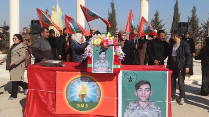 Girseya gel cenazeyê şehîd Beşar bi dirûşmên “Bi can, bi xwîn em bi te re ne şehîd” li Pakrewangeha Şehîdan a li bajarokê Hikumiyê spart axê.